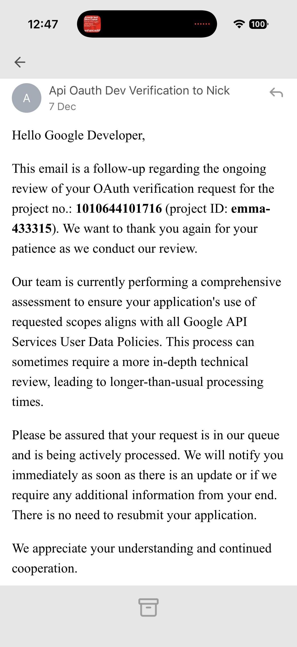 Also, I got another email from Google today letting me know they'll still vetting my request for increased permissions.