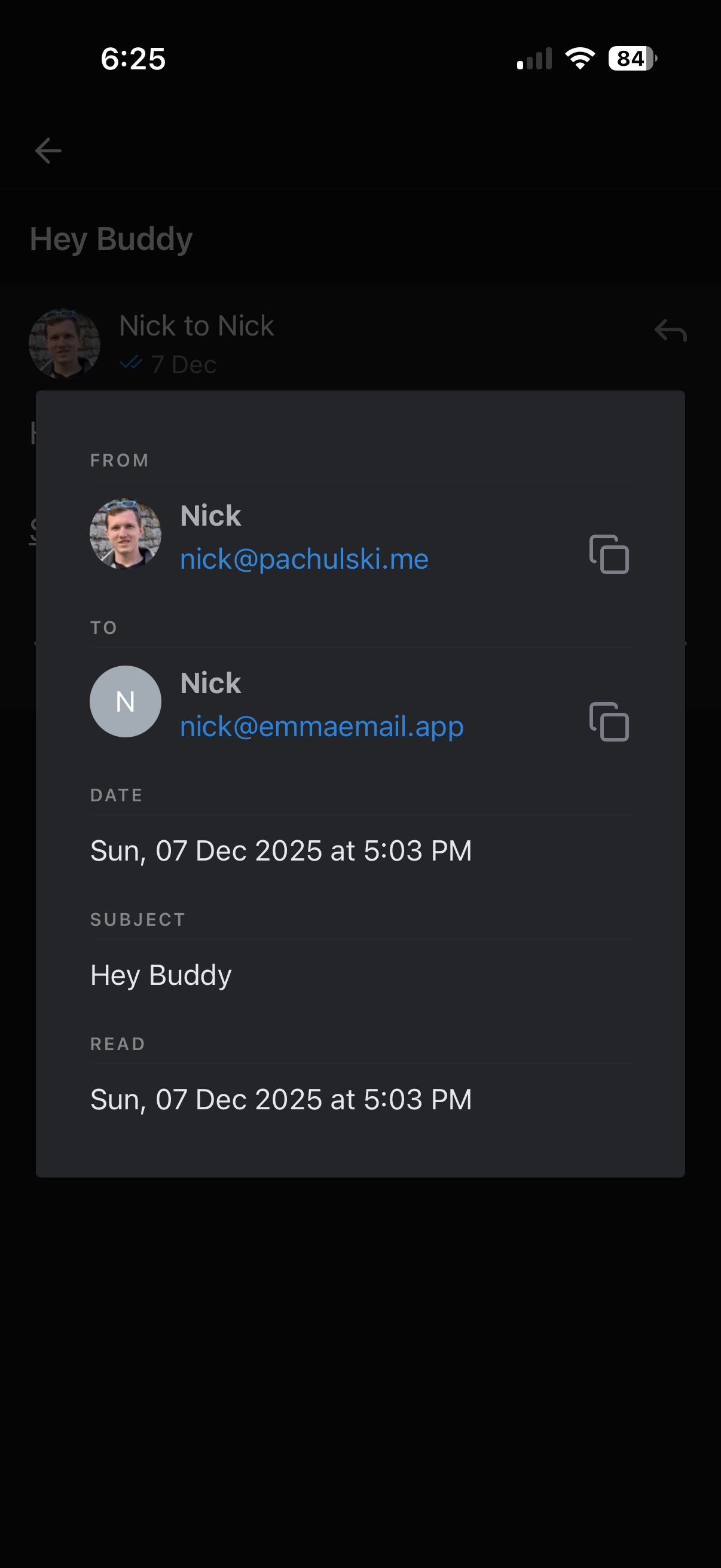 Soon I will start asking you for money. My plan is to give away a free month of Emma to each new user and then ask for your permission to start charging for pro features. Pro features will be read receipts, set aside, one-tap unsubscribe, email to text 2fa codes, and dark mode. Pricing is hard; right now I'm thinking I'll list two plans: $10 monthly or $100 yearly. If you opt out you can still use Emma; with a single account and without those pro features. If you're just into Emma for her minimalist design: She's free, forever.